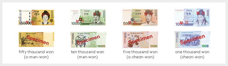 - When you need to exchange your foreign currency into Korean won, visit a bank, exchange service center, or an authorized exchange. (Bank business hour: 09:00-16:00, closed on Saturdays, Sundays and public holidays.)
